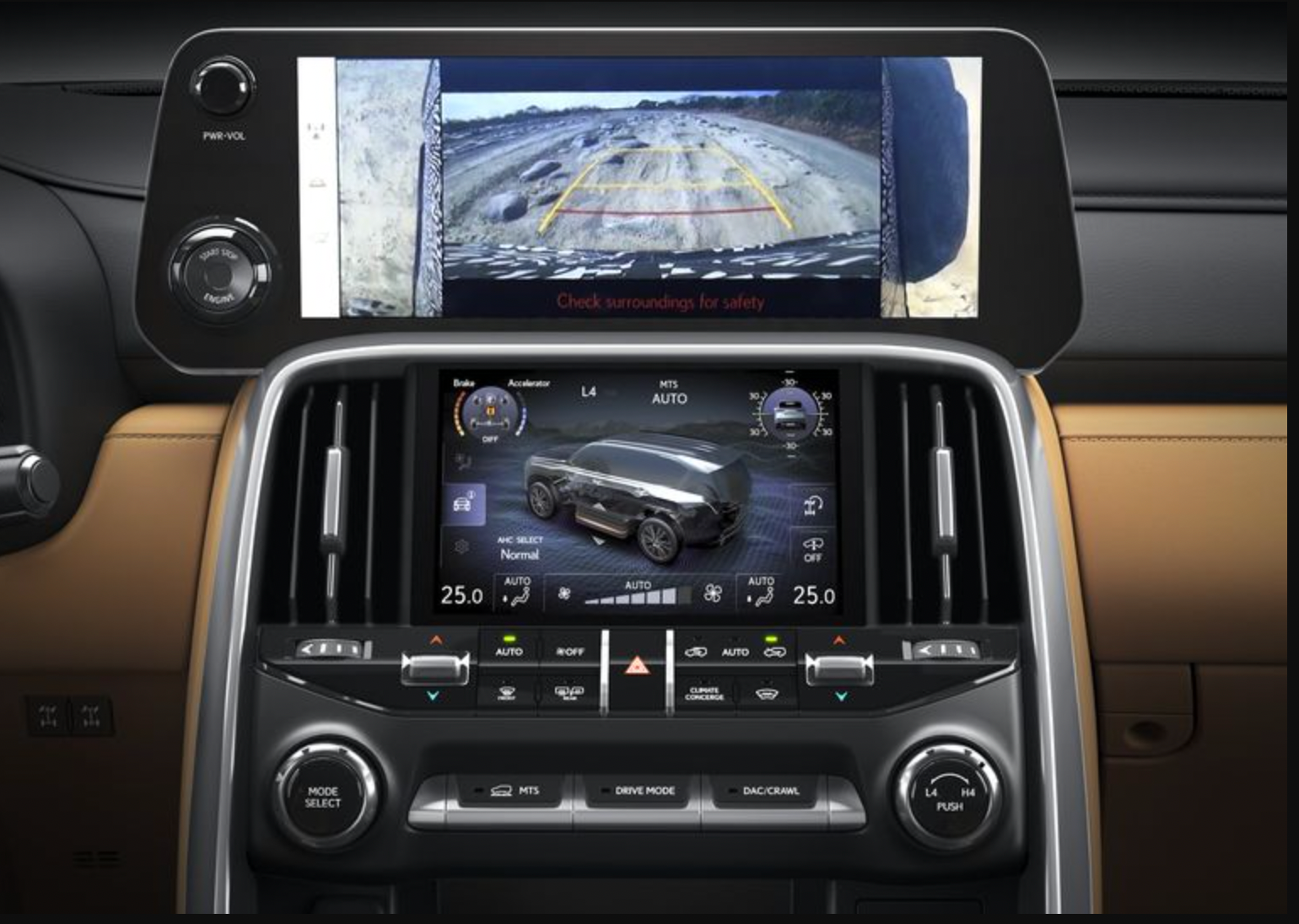 Lexus utilizes a GA-F platform to ensure that the load is more balanced from the start. Its stability can assist with off-roading drives as well as speedy on-road maneuvers. A double wishbone suspension, mounted high for ground clearance, has the travel length needed to help with bound and rebound.