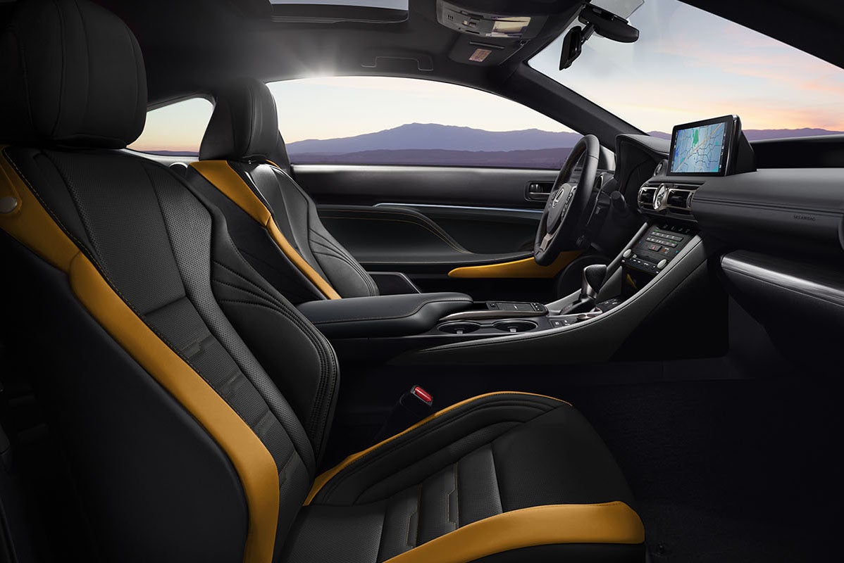 With seats covered in NuLuxe faux leather or perforated leather upholstery, all Lexus interiors are designed with comfort in mind with details created by expert craftsmen. RC interior choices are Black NuLuxe, White NuLuxe, Black and Yellow Nuluxe and Circuit Red NuLuxe.