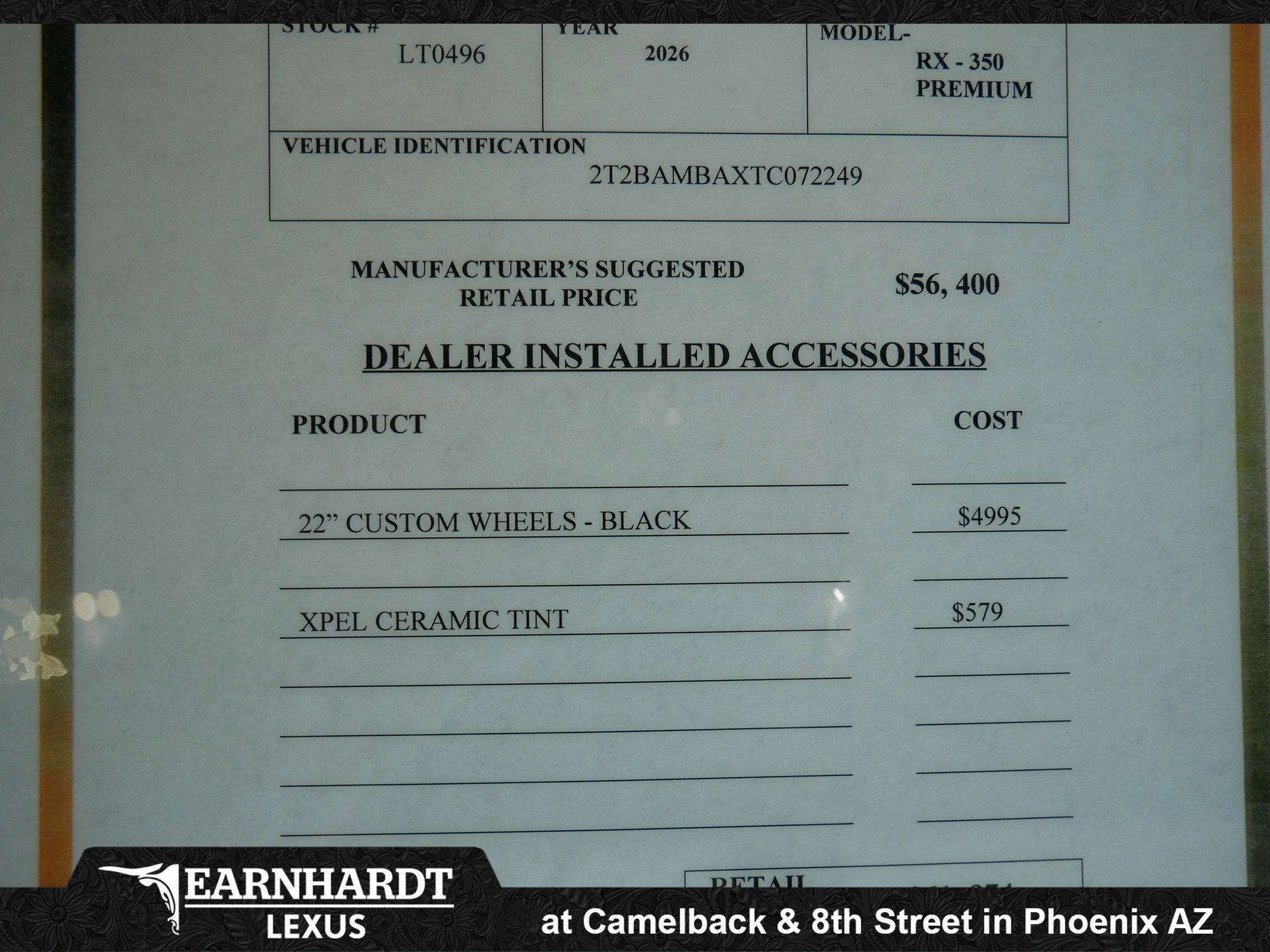 At this dealership, most new vehicles at Earnhardt Lexus include an “Arizona Window Tint Package” (sometimes referred to as the “Protection Package” or “No Bull Protection Package”) inclusive of highly-demanded, popular items designed to protect your investment such as window tint to help shield your interior from the intense Arizona sun. Price of the “Arizona Window Tint Package” is $579 at this dealership for most Cars, Vans, CUVs and SUVs. For some specific vehicles a Clear-Bra has been added and will be reflected accordingly in the price-stack. On all vehicles, actual vehicle sale price and payments may vary for various reasons - including but not limited to - applicable manufacturer rebates, special limited time offers, dealer incentives, taxes, fees, and buyer's credit qualifications, dealer installed accessories, market product (or vehicle) scarcity and $699.00 dealer doc fee. Financing on approved credit. Must qualify for some offers. Some offers may not be available with special financing, lease and certain other offers.